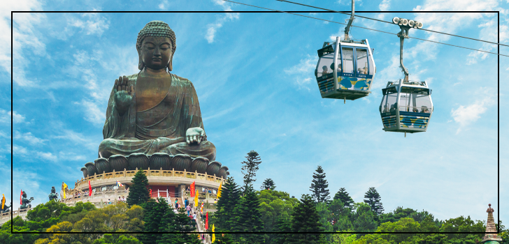 โดยนำท่านนั่ง กระเช้าไฟฟ้า NONGPING 360 องศา ข้ามเขาหลายลูกที่มีความยาวถึง 5.7 กิโลเมตร โดยเริ่มขึ้นกระเช้าจากสถานีตุงซุงมุ่งหน้าไปยังปลายทางที่หมู่บ้านนองปิง เลื่อนผ่านทะเลจีนใต้และวนอุทยานลันเตาเหนือ รวมระยะเวลา 25 นาที จากมุมมองด้านบนขณะนั่งกระเช้าลอยฟ้านั้น ท่านจะสามารถมองเห็นทัศนียภาพของสนามบินนานาชาติฮ่องกง พร้อมชื่นชมทิวทัศน์และภูมิประเทศได้เกือบทุกๆส่วนของเกาะลันเตา ที่เต็มไปด้วยภูเขาและความเขียวขจีของป่าไม้ ตั้งแต่จากใจกลางเมืองตุงชุงไปจนถึงหมู่บ้านนองปิงเลยทีเดียว ทั้งยังสามารถมองเห็นพระพุทธรูปทองสัมฤทธิ์ประทับกลางแจ้งองค์ใหญ่ที่สุดในโลกได้อีกด้วย จากนั้นนำท่านเดินทางผ่านหมู่บ้านนองปิง ซึ่งจะมีร้านค้า ร้านขายของฝาก ของที่ระลึกต่างๆ ตั้งอยู่เรียงรายตลอดสองข้างทาง แล้วมุ่งหน้าต่อไปยังทางขึ้นบันได 268 ขั้น เพื่อขึ้นสู่ พระพุทธรูปเทียนถาน ซึ่งประดิษฐานอยู่คู่กับวัดโป๋หลินมาเป็นเวลาช้านาน มีความสูงเหนือระดับน้ำทะเล 371 เมตร องค์พระสร้างขึ้นจากการเชื่อมแผ่นทองสัมฤทธิ์ถึง 200 แผ่น หนัก 250 ตัน และสูง 34 เมตร รวมมูลค่าในการก่อสร้างกว่า 60 ล้านเหรียญฮ่องกง องค์พระนั่งอยู่บนฐานกลีบดอกบัว ยกพระหัตถ์ขวาและแบพระหัตถ์ซ้ายไว้บนตัก พระเนตรมองลงมาด้วยความเปี่ยมเมตตา