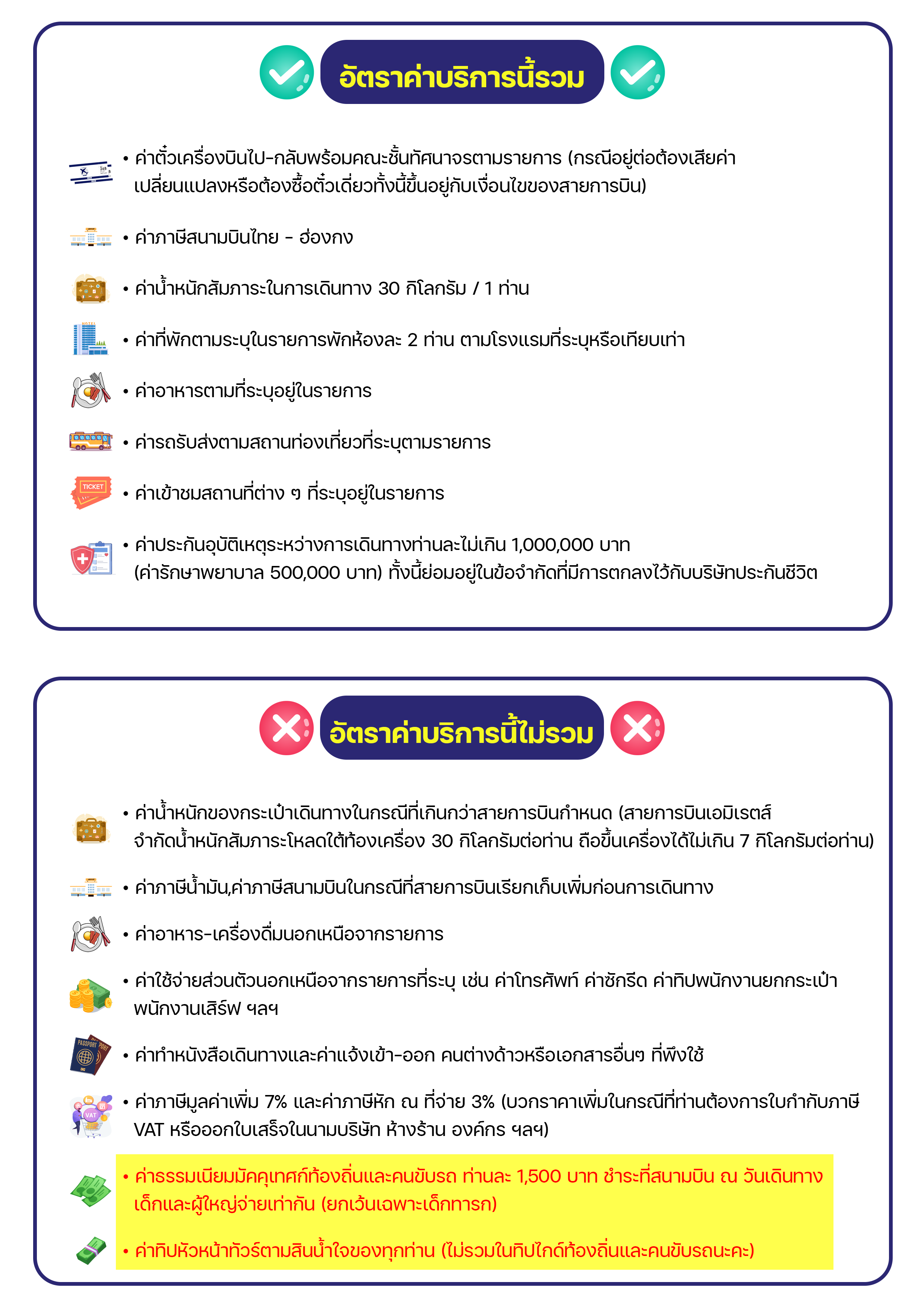 • ขึ้นกระเช้านองปิง พระใหญ่เทียนถาน • นั่งรถรางพีคแทรม • อ่าวรีพัลส์เบย์ • วัดเจ้าแม่กวนอิมฮองฮำ • วัดหวังต้าเซียน • วัดแชกงหมิว • วัดกวนไท พิเศษ! เมนูห่านย่างรสเลิศ,บุฟเฟต์ชาบููสไตล์ฮ่องกง เครื่องดื่ม เบียร์ไม่อั้น!! อัปเกรดพักโรงแรม 4 ดาว ติดถนนนาธาน ย่านช้อปปิ้งจิมซาจุ่ย PRUDENTIAL HOTEL